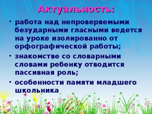 - работа над непроверяемыми безударными гласными ведется на уроке изолированно от орфографической работы;