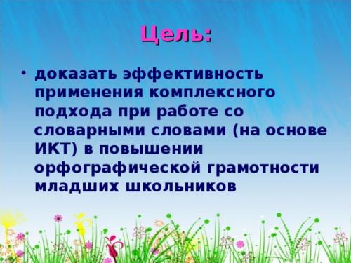 - доказать эффективность применения комплексного подхода при работе со словарными словами (на основе ИКТ) в повышении орфографической грамотности младших школьников