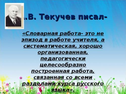«Словарная работа- это не эпизод в работе учителя, а систематическая, хорошо организованная, педагогически целесообразно построенная работа, связанная со всеми разделами курса русского языка».