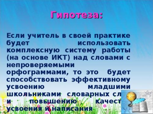 Если учитель в своей практике будет использовать комплексную систему работы (на основе ИКТ) над словами с непроверяемыми орфограммами, то это будет способствовать эффективному усвоению младшими школьниками словарных слов и повышению качества усвоения и написания