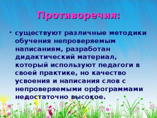 - существуют различные методики обучения непроверяемым написаниям, разработан дидактический материал, который используют педагоги в своей практике, но качество усвоения и написания слов с непроверяемыми орфограммами недостаточно высокое.