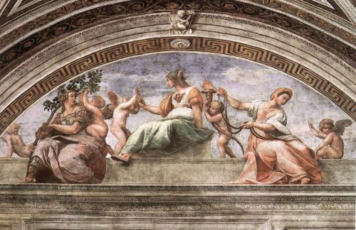 Рафаэль Санти - Фреска Добродетели и закон расположенная в одной из 4-х Ватиканских комнат - 151113 аркад, расписанных 52 фресками на библейские сюжеты, возвели во внутреннем дворе Ватикана по проекту и эскизам Рафаэля. Эти лоджии имеют неофициальное название "Библии Рафаэля".