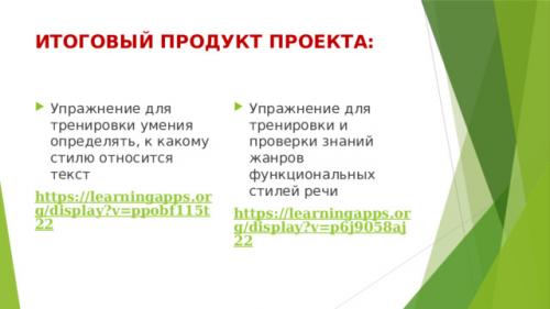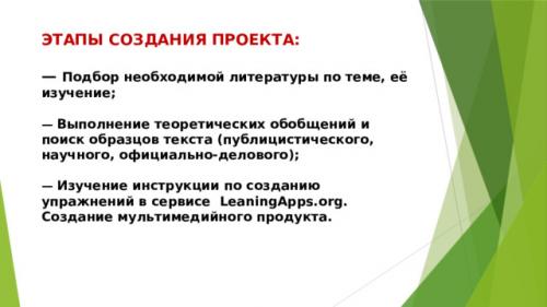 ЭТАПЫ СОЗДАНИЯ ПРОЕКТА: — Подбор необходимой литературы по теме, её изучение; — Выполнение теоретических обобщений и поиск образцов текста (публицистического, научного, официально-делового); — Изучение инструкции по созданию упражнений в сервисе LeaningApps.org. Создание мультимедийного продукта.