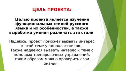 ЦЕЛЬ ПРОЕКТА: Целью проекта является изучение функциональных стилей русского языка и их особенностей, а также выработка умения различать эти стили . Надеюсь, проект поможет вызвать интерес к этой теме у одноклассников. Также надеемся вызвать интерес к теме с помощью тренировочных упражнений, таким образом можно проверить свои знания.
