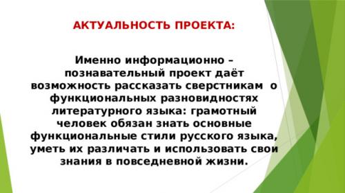 АКТУАЛЬНОСТЬ ПРОЕКТА: Именно информационно – познавательный проект даёт возможность рассказать сверстникам о функциональных разновидностях литературного языка: грамотный человек обязан знать основные функциональные стили русского языка, уметь их различать и использовать свои знания в повседневной жизни.