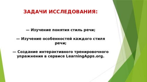 ЗАДАЧИ ИССЛЕДОВАНИЯ : — Изучение понятия стиль речи; — Изучение особенностей каждого стиля речи; — Создание интерактивного тренировочного упражнения в сервисе LearningApps.org.