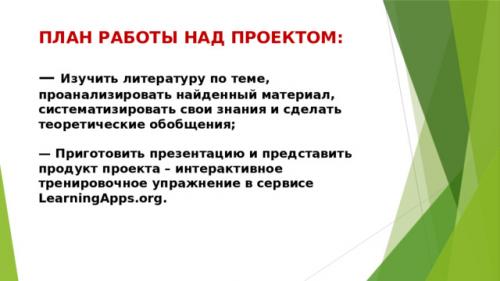 ПЛАН РАБОТЫ НАД ПРОЕКТОМ: — Изучить литературу по теме, проанализировать найденный материал, систематизировать свои знания и сделать теоретические обобщения; — Приготовить презентацию и представить продукт проекта – интерактивное тренировочное упражнение в сервисе LearningApps.org.