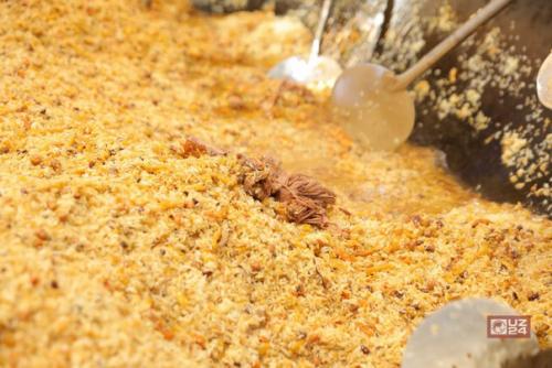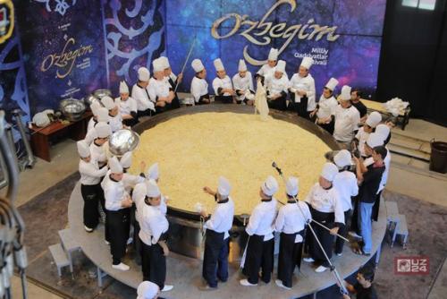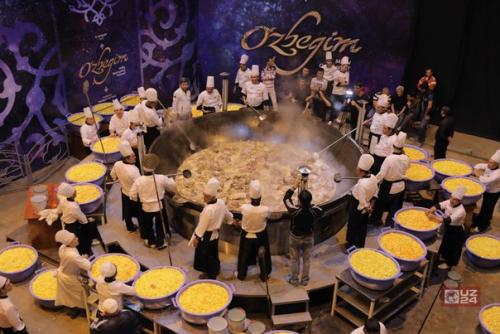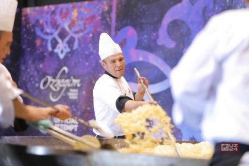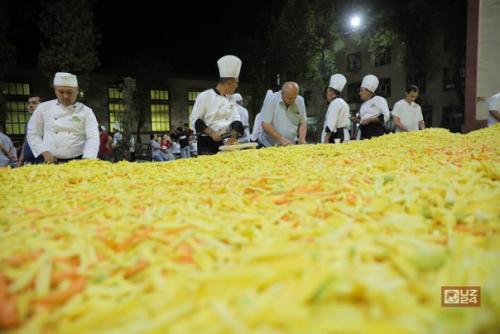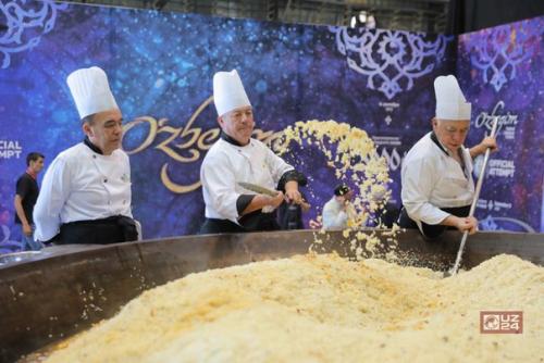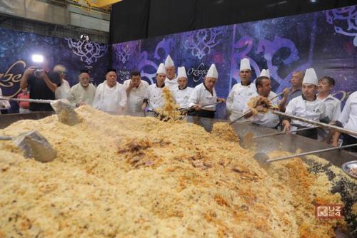 Более 50 именитых ошпазов со всего Узбекистана собрались, чтобы приготовить этот плов. Блюдо размешивали шумовками длиной более 2 метров.