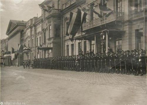 На фото: 85 пехотный выборгский полк выстроился на английской набережной в Петербурге для встречи своего сиятельного шефа - кайзера германской империи Вильгельма второго, 1897 г.