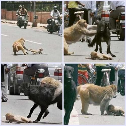 Животные там не редкость и постоянно в различные переделки попадают. Вот и этот малыш, перебегая дорогу, был сбит мопедом, к счастью не насмерть. Лежащей обезьянкой решила было полакомиться огромная собака. Но была атакована и прогнана подоспевшей на подмогу мамой.