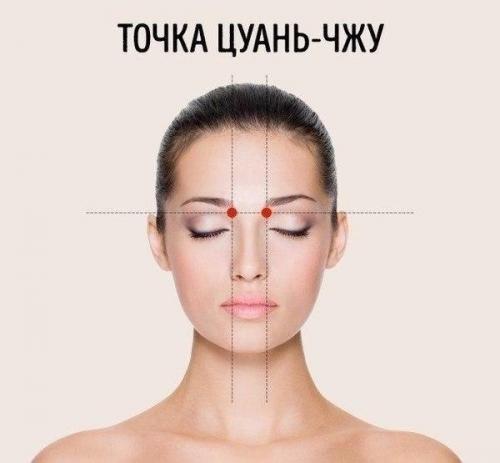 2. симметричные точки, которые располагаются у основания внутреннего края бровей. Массаж этой области также избавляет от насморка и улучшает остроту зрения. Массировать в течение 1 минуты надавливанием или круговыми движениями.