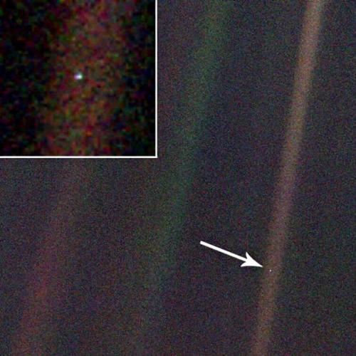 На картинке - земля с расстояния в 6 млрд. Километров. Весь твой мир - маленькая точка. Все твои печали и радости, твоя любовь и твоя яростная ненависть - на этой маленькой песчинке. Все, что тебе дорого - тут. И на этой небольшой песчинке ты летишь в бесконечно огромной пустоте, вперед, в пустоту. Из ниоткуда в никуда. Фото сделано аппаратом "вояджер - 1", в период между 14 февраля и 6 июнем 1990 года.