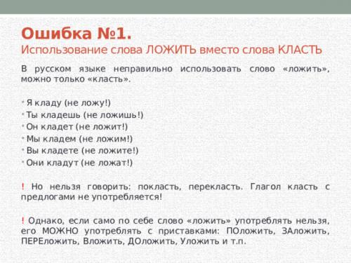 Ошибка №1. Использование слова ЛОЖИТЬ вместо слова КЛАСТЬ