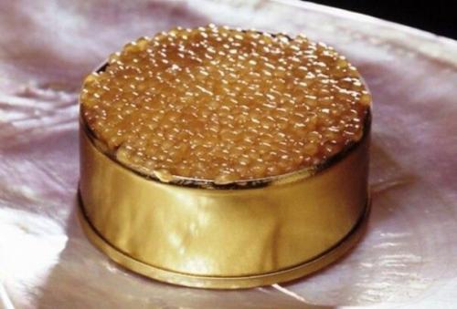Икра "Алмас", которую получают от белуги - альбиноса, обитающей в каспийском море, продается в баночке из чистого золота за 25 000 долларов. Икринки обладают бледно - янтарным цветом, а сама икра производится в Иране.
