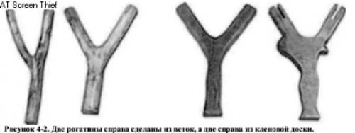 Я упустил из виду такое оригинальное метательное оружие , как рогатка. Несмотря на видимую простоту, это оружие заслуживает самого пристального внимания. В умелых руках сия мини катапульта может стать весьма грозным оружием. Я не знаю человека, который бы в детстве не делал рогатки и не стрелял по воробьям (аяяй!), бутылкам и фонарям. Впрочем, как ни проста она, а технология изготовления рогатки может быть разной. В зависимости от мощности используемой резины, она может делаться с упором для руки, либо без. Некоторые любители оригинальности приспосабливают к ней прицелы и стабилизаторы. Ниже мы рассмотрим, как правильно изготавливать рогатку , используя различный материал. Обычно ее делают из древесины, но можно использовать металл, рога животных (редко) и другие подручные средства. На рисунки ниже показаны примеры рогатин из веток дерева и клееной доски.