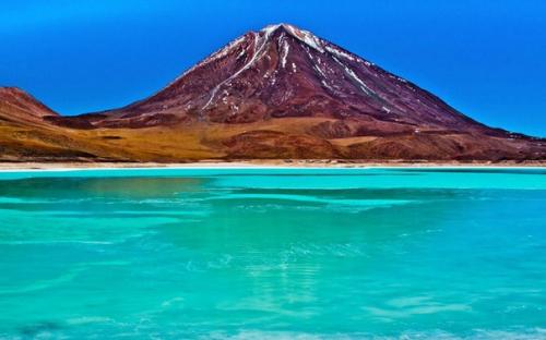 Это соленое озеро расположено в Боливии и имеет зеленый цвет, потому как располагается у подножия вулкана. За счет массы минералов и многих других веществ вода и приобретает насыщенный изумрудный цвет.