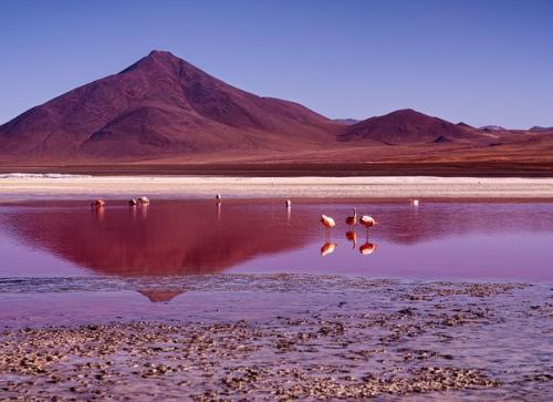 В Боливии располагается еще одно разноцветное озеро - большое соленое озеро лагуна Колорадо, расположенное в национальном заповеднике Эдуардо авароа в юго-западной части. Оно в яркий красный цвет окрашено. Правда, на этот раз дело не , внимание, только в осадочных породах, но и в пигментации водорослей, обильно произростающих там.
