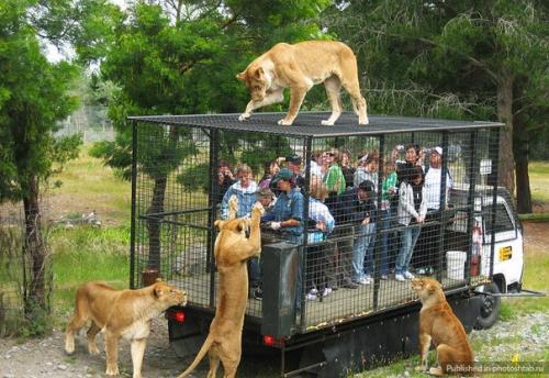 Здесь на специальных автомобилях устанавливают клетки и посетителям предоставляется возможность оценить размеры и мощь сильных хищников в дикой природе. Места на прогулку расписаны заранее, т. к. выделяется не более 20-ти билетов в сутки.