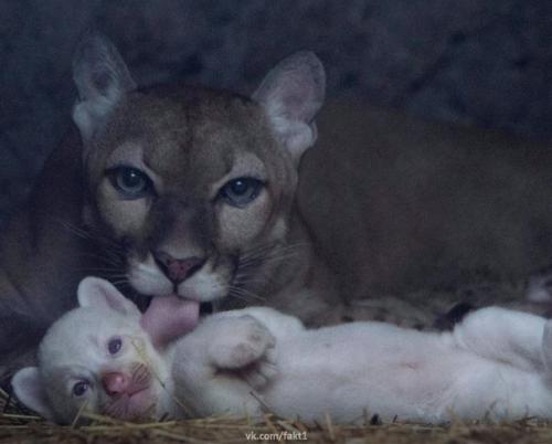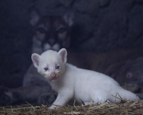 Драгоценный детеныш - альбинос родился несколько недель назад вместе со своим братом и сестрой. Малышу нравится спать, прижавшись к маме, играть с ней и братом или сестрой.