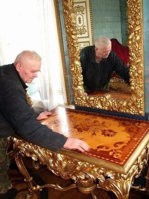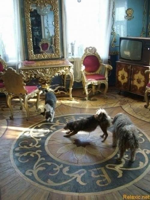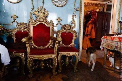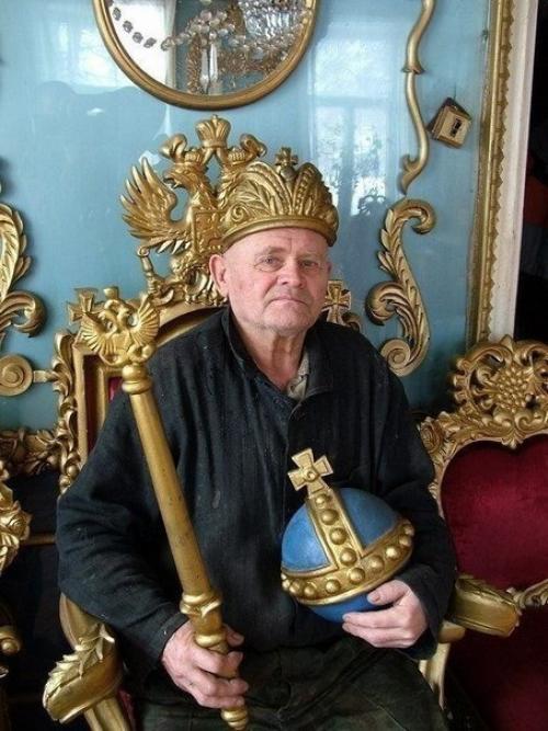 Да не живет, а царствует! Своими руками создал в старом доме дворцовые интерьеры, смастерил скипетр, державу, корону и сел на трон. Есть и придворные у него, куда ж без придворных - одиннадцать собак и две кошки.